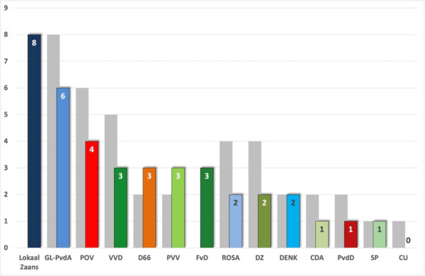 Lokaal Zaans ging van nul naar acht zetels want Doeves-de Boer zat op persoonlijke titel in de raad. Fusiepartij GroenLinks-PvdA van acht naar zes (-2). POV behaalde vier zetels (-2), VVD drie (-2), D66 drie (+1), PVV drie (+1), FvD drie (+3), Rosa twee (-2), DZ twee (-2), Denk twee (0), CDA één (-1), PvdD één (-1), SP één (0), en CU nul (-1).